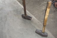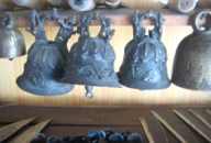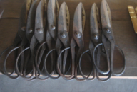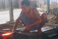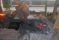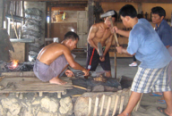 PHOTOS: Left Column: 1. A steel blade on the anvil. 2. Two of the three sledge hammers, used to shape the steel. 3. The blacksmith at the anvil with the red hot heated blade. 4. Scissors that made at the blacksmith shop. These scissors were like the ones used in the cigar workshop. Center, Top: Man at the bellows, stoking the fire of the forge. Center, Bottom: The fire of the forge with the buddha-like elder working the bellows above the fire of the furnace. Right Column: 1. Advertisements for liquors papering the doors to the blacksmith shop. 2. The blacksmith transferring the neo-colored steel from the heat of the fire to the anvil. 3. Three men wielding sledge hammers take their turns flattening the red hot heated blade on the anvil. 4. Cast bells on display at the blacksmith shop.