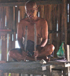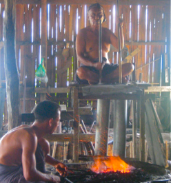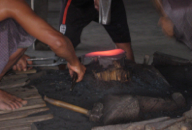 Our boatman guided the longboat alongside a dock as the sounds of Vulcan rang out. Doors papered with advertisements for London Rum and Grand Royal Whiskey framed the workshop’s entrance, marking this the territory of mighty men. One step over the doorsill confirmed my suspicions of this shop as a fundamentally masculine domain. A buddha-like elder male sat crosslegged on his elevated perch above the flames which he stoked as he worked the bellows. On the ground in a smoky atmosphere, three muscular young men wielded sledge hammers to flatten a future blade, red hot and glowing neon orange, held on the anvil by the blacksmith. Henry and I watched and listened to the rhythmic pounding on the metallic shape, which paused only when the object cooled beyond its malleability, then was reheated to day-glow color in the open flames of the furnace. This rough and tough process surprisingly produced some delicate objects. As we walked around the perimeter of the room, delicate bells, gongs, and chimes lined the rough wooden shelves. More functional objects displayed here included swords, knives, and scissors. I was also heartened to notice an example of the spear used by the lake fisherman we had watched earlier on our boat trip on this lake. This long spear shape was identiacal to the one he used, its four arched prongs intended to trap a live fish in his funnel-shaped net apparatus. This blackshmith shop has contributed to the independence and resourcefulness of the Inle Lake communities. Their work provides tools of all description for the people who earn their livelihood in fishing, farming, and the crafts industries; and, is supportive to the needs of the various Buddhist pagodas which proliferate the territory in and around the lake.