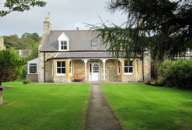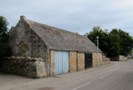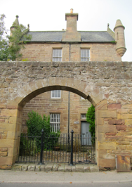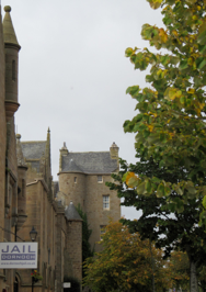 PHOTOS: Left Column: 1. View of Dornoch Cathedral’s bell tower. 2. The Meadow’s House. 3. A charming cottage. 4. A good looking, old fashioned, utilitarian garage. Center, Top: View of the Bishop’s Palace, now Dornoch Castle Hotel. Center, Bottom: Henry, with his Dornoch Jail shopping bag walking across the village green. Right Column: 1. View of the old town Jail.2. View looking down Castle Street toward the Bishop’s Palace, now the Dornoch Castle Hotel.