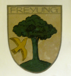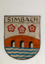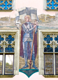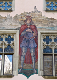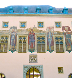PHOTOS: Top Two: 1. The Neo-Gothic tower of the Altes Rathaus added by Heinrich Baron von Schmidt between 1889 and 1892. 2. View of the Altes Rathaus as seen from the fortified castle, Veste Oberhaus on the mountain crest opposite the Danube. Middle Three:. 1.2.3 Coats of Arms of three Passau families, some dating from the Middle Ages. These graphic images decorate the walls of the restaurant inside the Altes Rathaus. Bottom Three: Façade of the Altes Rathaus with its murals depicting the emperor Ludwig of Bavaria, painted by Joseph Hengee in 1922.