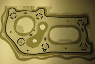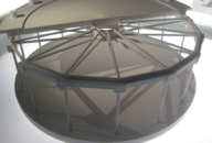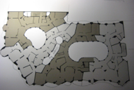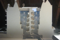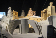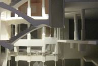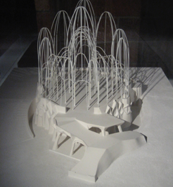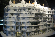 PHOTOS: Left Column: 1. Casa Milà or “La Padrera” 2. Maquette, the attic showing ventilation and chimneys on the roof. 3. & 4. Schematic drawing and plan of the apartment building, showing the interior courtyards. Center, Top: Model demonstrating the natural weight and shape of chains hung. Center, Bottom: The reverse shape of chains hung, used as a model to design supporting columns. Right Column: 1. Architectural model of Casa Milà. 2. Maquette showing the interior open structure of Casa Milà. 3. Detail of the open structure. 4. Architectural model showing the concept of exterior support, using the model of spokes of a wheel.