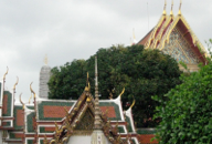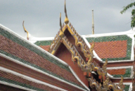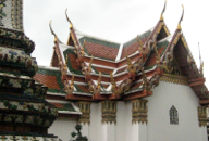 Wat Phra* Chetuphon, known by it’s nickname, Wat Pho, is the oldest and largest temple in Bangkok, dating from the 16th Century. It is located in the “Old City” at the center of the city, which is the most spiritual and historical area of Bangkok. “Wat Pho” is Thailand’s foremost center for education; it has a monastery attached. This was my first exposure to Thai temple architecture, and I was overwhelmed by the graceful forms of the architecture, principally revealed in the multi-layered roofs of the temple buildings, in the strong, abundant colors, and in the patterned decoration which abounds. Every surface seems to be covered in decorative tiles. Architectural detailing is often gold-colored. At this temple, the roof tiles, once imported from China, are brightly colored in red-orange and green. Every form has many layers, levels, and tiers. Spires of varying shapes reach heavenward. This temple was rebuilt and expanded by Thailand’s king, Rama I in the 1780’s. Amongst the figures within the grounds of Wat Phra Cheuphon are many Chinese sculptures, used as ballasts on Thai ships returning from China. Amongst these figures are two large gate guardians, Farang guards, thought to be Chinese depictions of Marco Polo. Each towering guard sports a western styled top hat on a head carved with a Chinese interpretation of European features. The Phra Si Sanphet Chedi, stupa-like forms, which house sacred Buddha images, are covered in decorative tiles that are actually broken plates, imported Chinese porcelain.