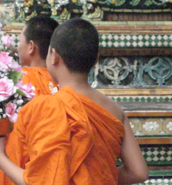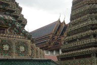 PHOTOS: Upper Left: Building Rooflines at Wat Pho. Lower Left: Temple building and edge of a Phra Si Sanphet Chedi. Center: Young students returning to the monastery. Upper Right: Roof of the Main Bot at Wat Pho. Lower Right: Details of the Phra Si Sanphet Chedi with their decorative tiles.